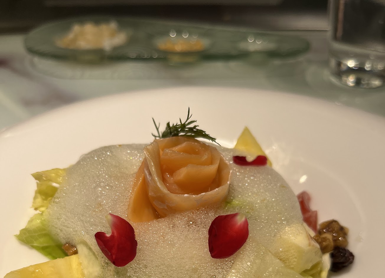1 海鮮清湯 2 松露百菇沙拉 3 燻鮭魚沙拉 4 海鮮(蝦 魚 干貝) 5 松阪豬(有三種料理方式 6櫻花蝦炒飯 7 和牛 8 甜點 9 餐中飲料和飯後飲料都很棒