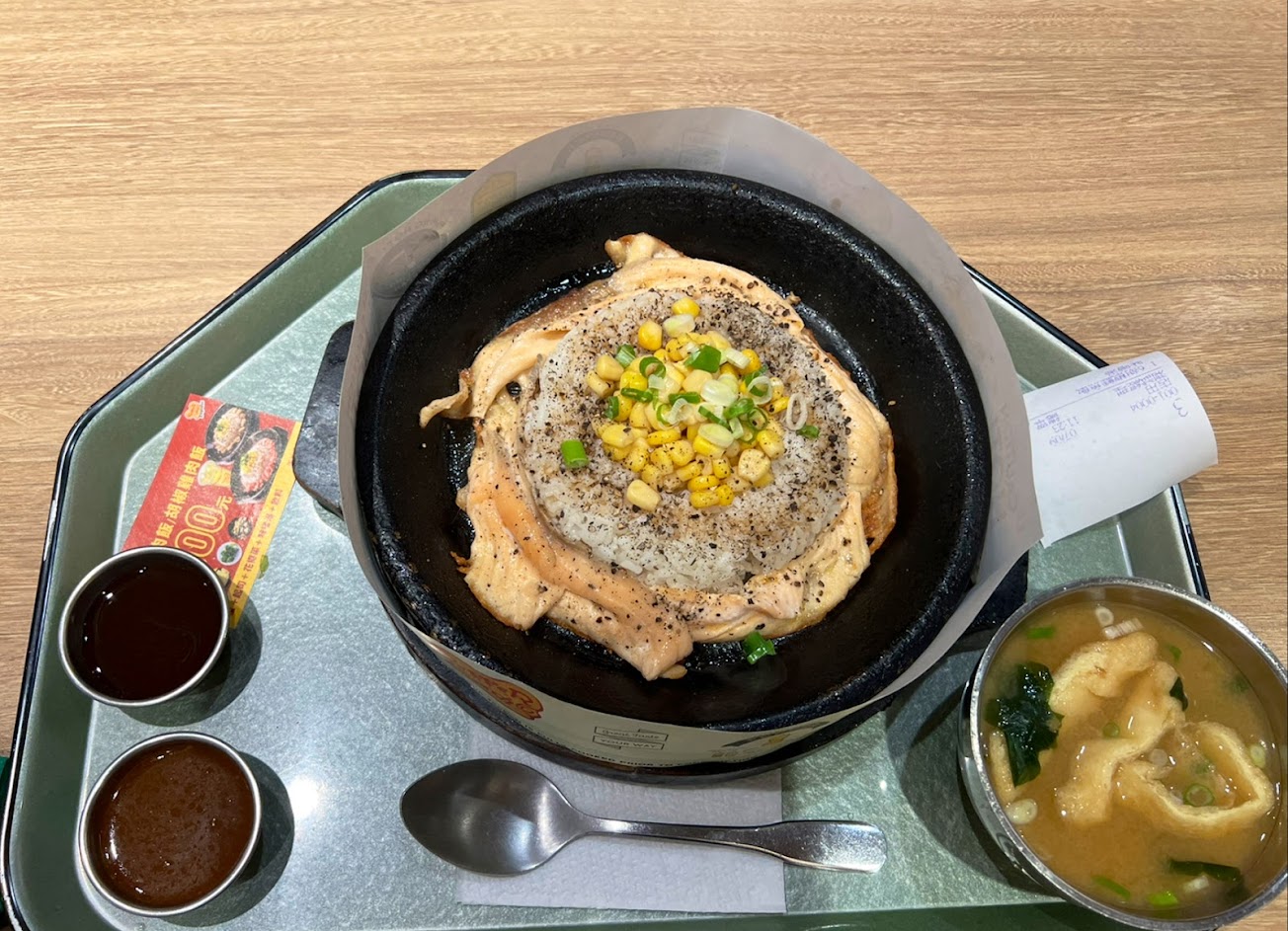 招牌胡椒牛肉飯好香啊!加顆蛋美味更加分,下次還要加菜加起司!只是味噌湯的部分有點小問題,很像白開水?既不台式也不日式,要說紫菜湯也沒有湯的味道⋯⋯要去跟櫃檯說的時候那時客人很多,希望下次去時湯已經改善? …