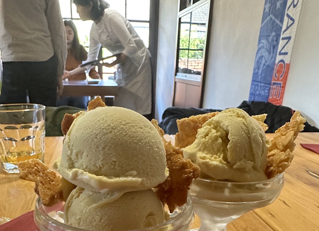 主廚範高溢(畢業於藍帶國際學院)對烹飪尤其是法國菜充滿熱情。 所提供的菜餚很正宗,讓人想起法國“鄉村小酒館”的菜餚。就像在“鄉村小酒館”一樣,廚師提供 100% 自製的食物,偏愛當地產品。 菜單上,我們享用了一份沙拉,配上真正的油醋汁、扇貝絲瓜絡和絲瓜絡。 然後,作為主菜,低溫烹製 10 小時的美味鴨肉搭配鷹嘴豆泥和用鴨油烹製的薯條。味蕾的一場盛宴! 最後,甜點是蘋果派,上面放一勺自製酸奶冰淇淋。