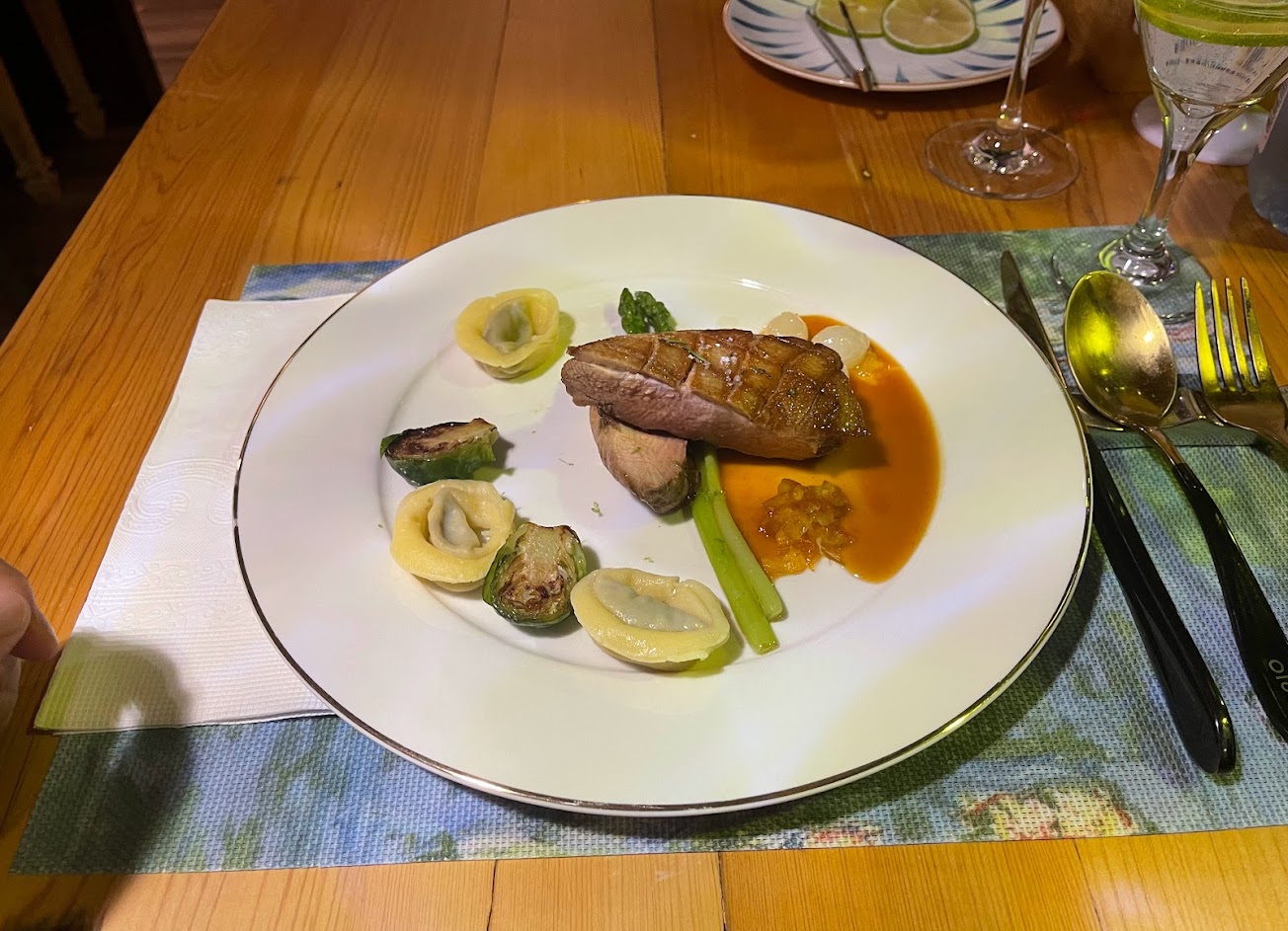 主廚會適時的出現,跟我們話家常,整個真的很有賓至如歸的用餐氣氛 後面慢慢端上桌的菜肴,每道都是充滿驚奇: 槍烏賊鑲尼斯風味蔬菜餡 爐烤橙汁櫻桃鴨胸 秘製醬汁牛頰牛尾 甜點千層蘋果盒