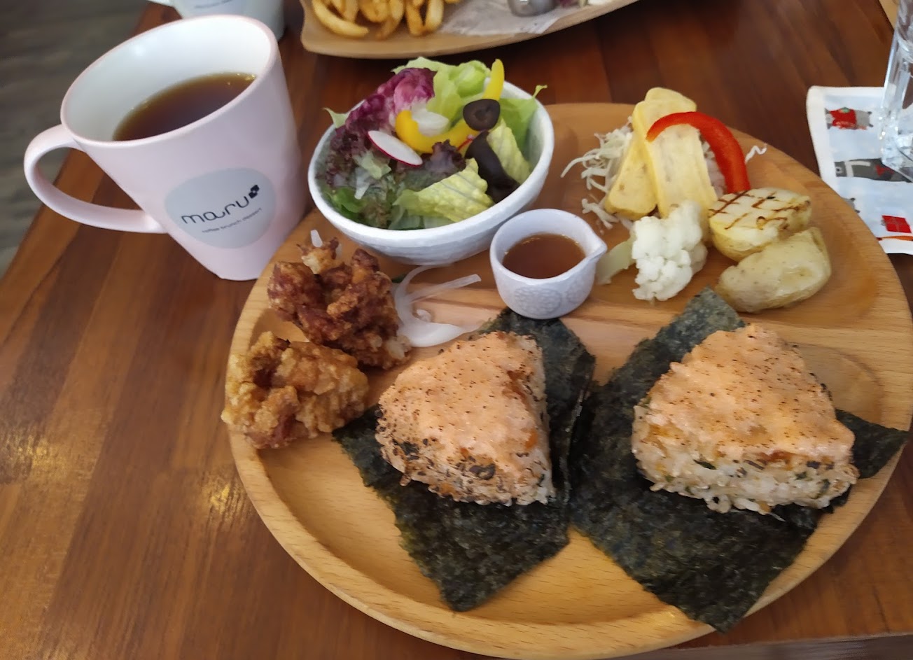 飯糰裡面的鮭魚非常紮實,唐揚雞很嫩但稍油,可惜培茶有點淡