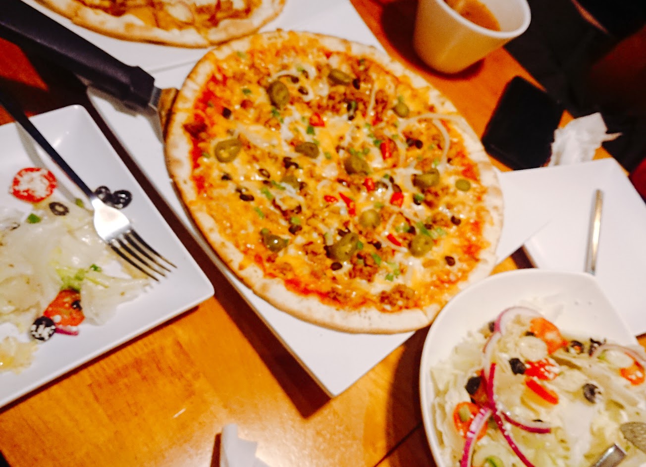 沙拉新鮮好吃,pizza餅皮香薄酥脆,佐料豐美味濃,每種口味分明不會膩。
