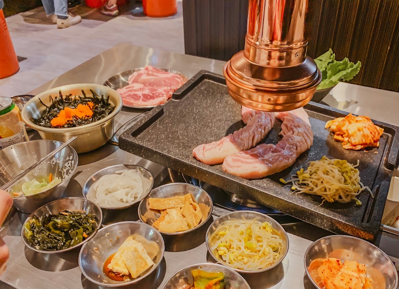 空間寬敞舒適 還有服務人員幫忙代烤 吸油煙的蠻強勁的,吃完身上不會有烤肉味 很適合來聚餐聊天 今天因為兩個人來,所以只點豬肉兩人套餐 小菜有無限量供應