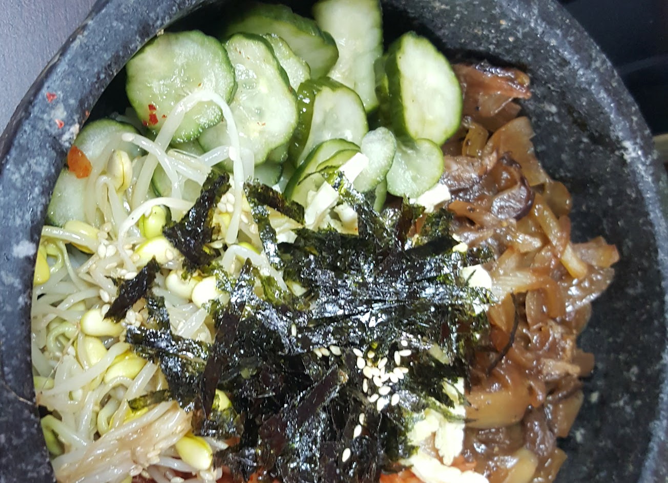 石鍋拌飯配菜滿豐富的,配上帶有一點辣度的泡菜很剛好,還有熱熱的石鍋有一些鍋巴,分量也蠻多的~