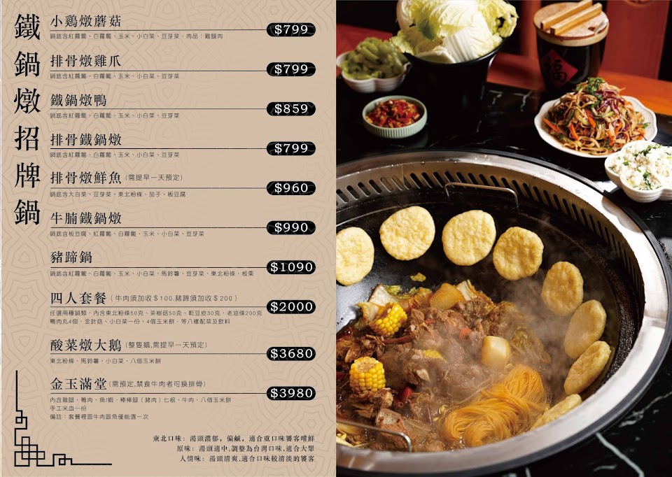 鐵鍋燉是啥?初體驗東北鐵鍋,一落座眼前桌面坎著一口大鐵鍋,這鍋之大!夠10人共食,店員熱情招呼我們,講解菜單上的各式特色套餐,當天點了紅燒牛腩鍋,加點特色小菜蔥拌豆腐及玉米餅,怕踩雷所以沒多點,經店員示範講解,原來鍋子下半是火鍋,上半部將玉米餅貼在鍋邊乾烙,烙好的玉米餅面軟Q底酥脆,微甜伴隨著淡淡的酒香,蔥拌豆腐口感像豆花再淋上店家自製的蒜茸辣椒,超美味的!牛腩已燉煮的軟嫩,牙口不好的亦可食用,來自東北黑龍江美麗的老闆娘與老闆,與我們分享著創業歷程,店雖不大但店主的熱情與大鐵鍋的烙餅,似乎已烙印在我們心中,在此推薦給想體驗不同的飲食文化的同好們,這裡還多了一味人情味? …