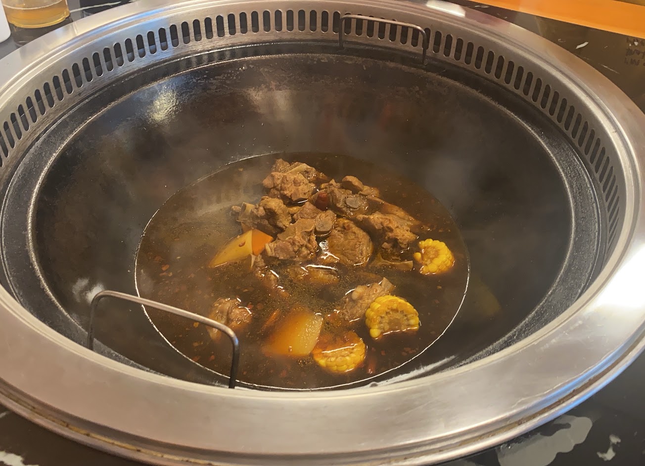 空氣中瀰漫著濃濃的香料味,讓人食慾爆棚,我們這一大鍋裡面的小雞燉蘑菇,朋友說完全沒有蘑菇味,小雞倒是很好吃?,排骨燉鮮魚,魚超嫩很是鮮美,可惜排骨選的不理想很柴,所有的食材吃起來,只有眼前看到的深深的醬色+醬味,這不是很奇怪嗎?我還問同桌朋友,你們會不會覺得少了什麼味道⋯⋯,不知道是不是我沒有用沾醬,也沒有配飯,單純吃這個鐵鍋裡面的食物,覺得沒有香氣只有醬(油)味