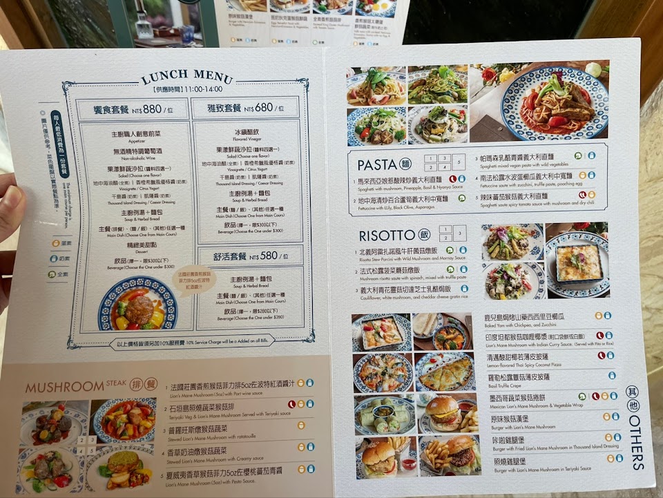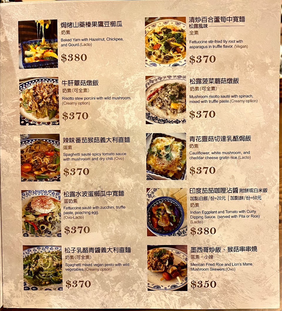 午餐的套餐有三種價位可供選擇,差別在於沙拉、無酒精葡萄酒和甜點的有無,最基本的套餐(580元)已經包含湯、麵包、主餐、飲品。午餐有排餐、義大利麵、燉飯和其他(漢堡、披薩…),不過排餐只有饗食套餐(880元)可以選,以素食來說,種類很多,餐點也好吃。