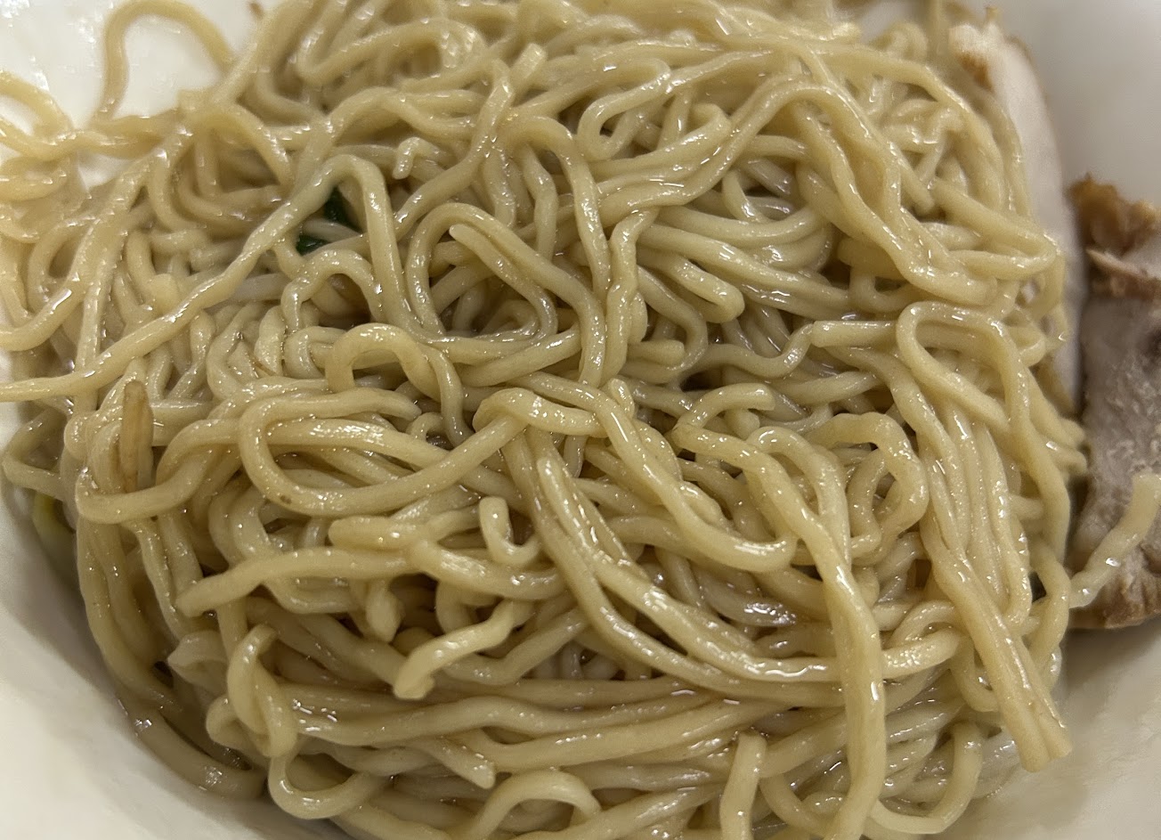 麵體是傳統潮汕細捲麵,拌上豬油跟紅蔥頭肉燥醬油,上面再鋪上熬湯頭用的瘦肉切片。乾麵沒有豬油的油耗味,口味算清淡。加一點點辣椒跟烏醋,整碗麵都被辣椒跟烏醋的味道壓過去,反而吃不出麵的味道。瘦肉片味如嚼蠟,又乾又柴,一大敗筆!