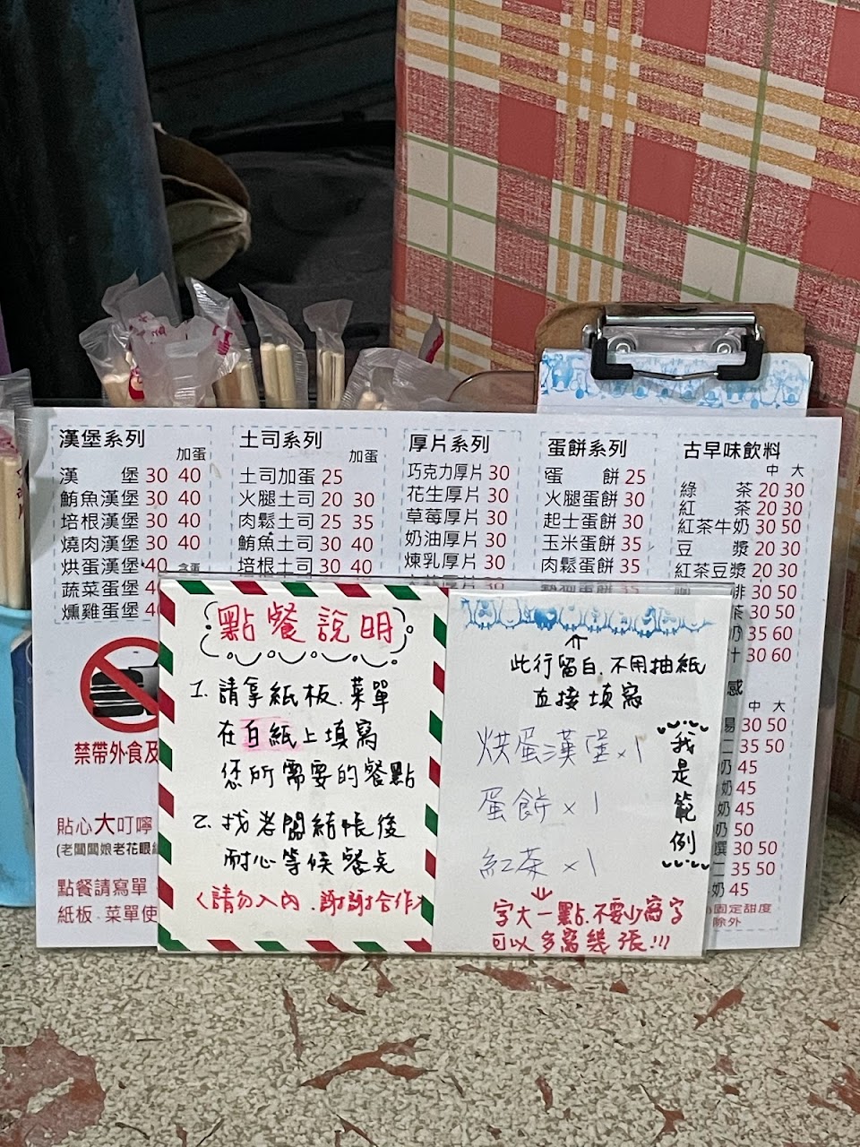 店家都有把規矩寫在桌上,請配合點餐,週日來,是爺爺負責點餐、先現金結帳,應該是媽媽還是奶奶負責製作,沒仔細看。