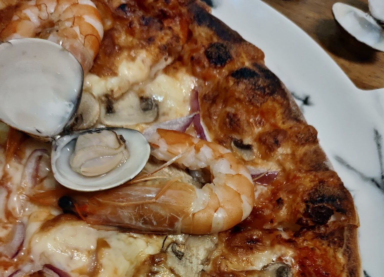 湯頭香菇味很重的鍋燒意麵 他們的蝦子很貼心的都撥好了 整體吃起來還不錯? 有機會再來試試披薩 …