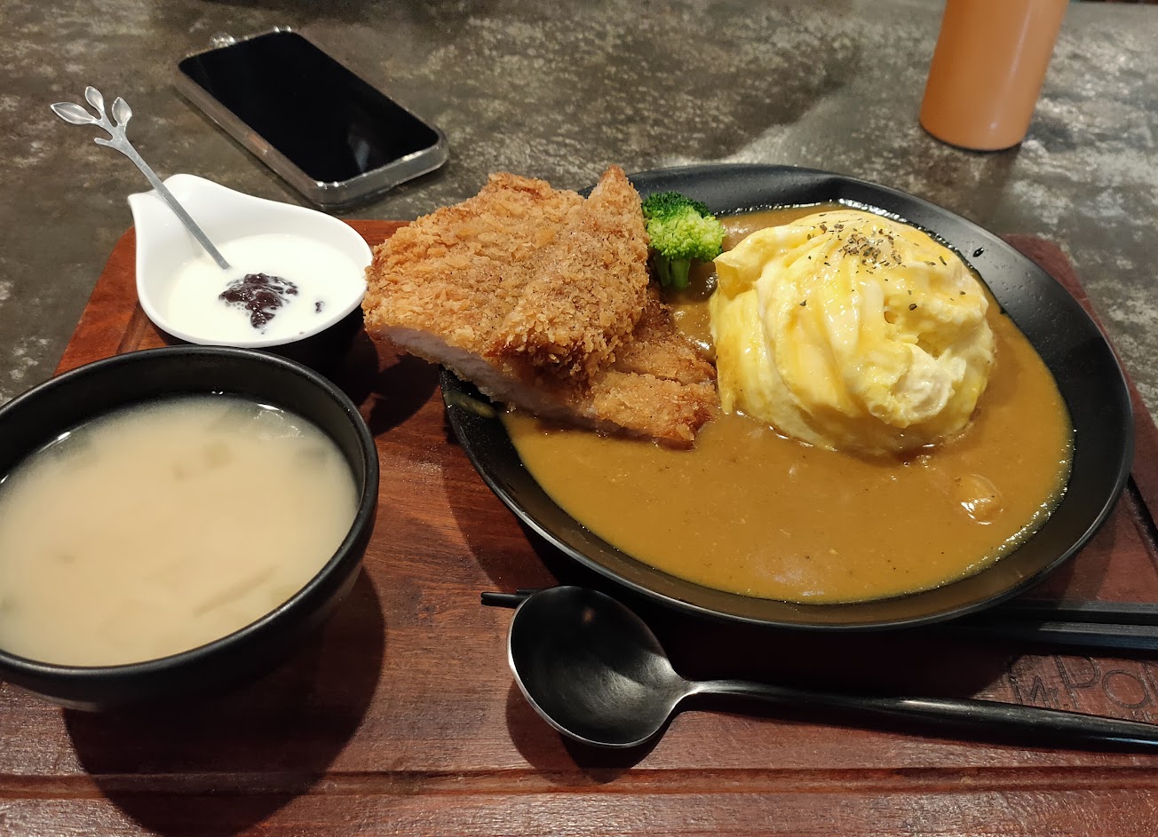 沙朗炸豬排飯的米飯上面有一個荷包蛋,美濃放山雞點烤餅,烤餅外帶完全不酥脆,口感很乾,只能沾著咖喱湯汁