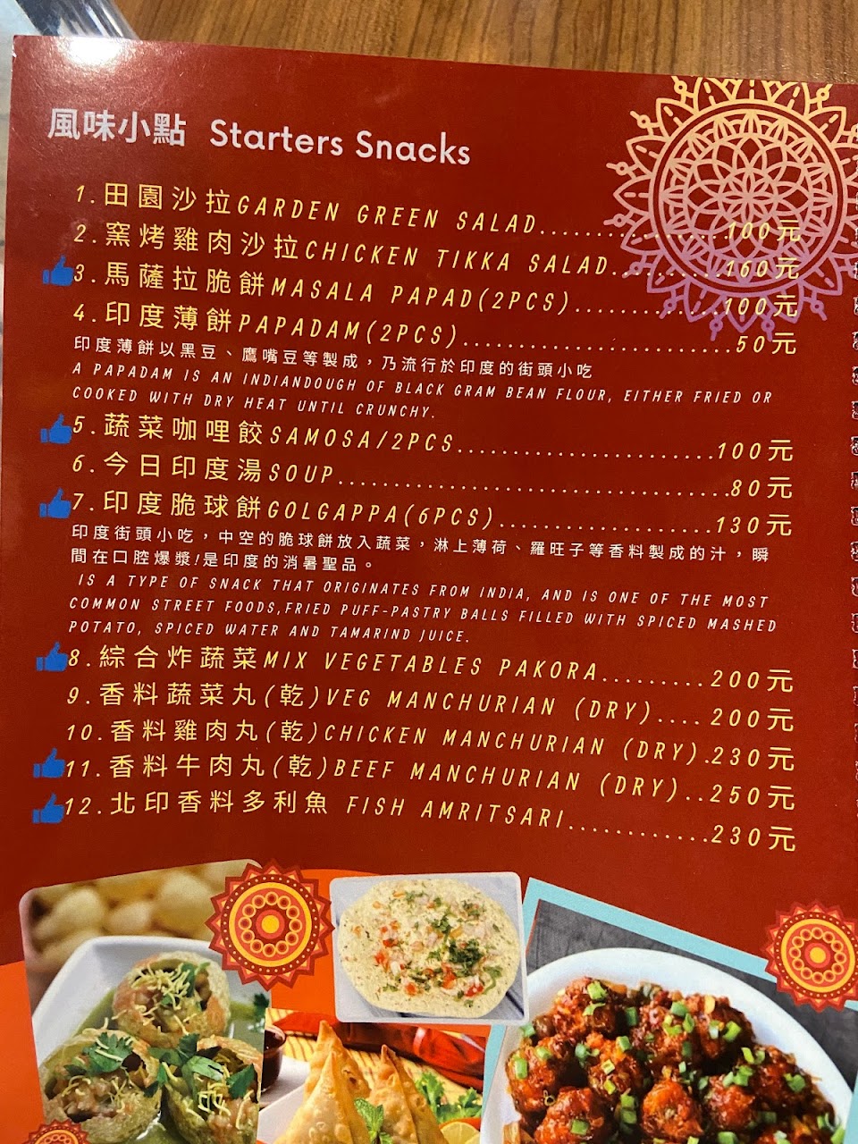 印度人老闆經營的印度料理,中文溝通無礙,喜歡印度式咖哩或各式香料料理的千萬要來試試。 〔例湯〕有點咖哩就會附贈,喝起來有點像是加番茄的玉米濃湯再撒上香料粉與黑胡椒增加風味。 〔印度脆球餅〕酥脆圓球注入有薄荷味的特調醬汁,一口吃到嘴裡脆球與涼甜的醬汁一併爆開,很特殊的味覺體驗。 〔印度餅NAAN〕NAAN有嚼勁又不會過油。點過原味、辣味香蒜跟綜合香料都不錯,因為咖哩味道較重,很適合用味道單純的沾著吃;有調味的單吃就好吃,沾咖哩吃起來則是更好入口(不會太乾)。 〔葫蘆巴奶油咖哩雞、羊肉綜合香料咖哩、綜合扁豆香料咖哩、德里黑扁豆豆咖哩〕咖哩系列分別用不同香料入菜,各有特色。 葫蘆巴奶油雞不同於印象中的薑黃咖哩,是帶有奶油香的白色咖哩,適合不能吃辣或喜歡奶香的。 羊肉綜合香料咖哩、綜合扁豆香料咖哩跟台灣人習慣吃的咖哩較相近,仔細品嚐則會發現各有不同的香料配方。羊肉咖哩調味比較重一些,可說是NAAN的殺手,手撕NAAN加咖哩一口吃很過癮,羊肉入味軟爛,喜歡羊肉不怕羊味的可以一試;綜合扁豆香料咖哩對吃葷吃素的來說都接受度很高,是道葷食跟素食可一起分食的咖哩。 德里黑扁豆咖哩的豆子風味相當突出,個人覺得會比較適合蔬食或豆子的愛好者。 〔綜合烤肉拼盤、香料塔都烤魚塊〕烤肉拼盤是雞肉卷搭配不同香料調味烤製的雞肉,整體來說雞肉有些偏乾,最好還是淋上檸檬沾著吃。 塔都烤魚塊倒是讓我們有些意外,魚肉口感軟硬適中,沒什麼腥味,魚本身前製香料調味,烤過灑上檸檬再沾醬吃起來風味層次非常豐富。 〔茴香飯〕印度香米粒粒分明,加上茴香等香料會讓人想一口接一口。2023/01 服務 內用 餐點類型 午餐 平均每人消費金額 $400-600 餐點:5 服務:5 氣氛:5 建議的餐點 香料塔都魚肉塊, 香料脆球餅