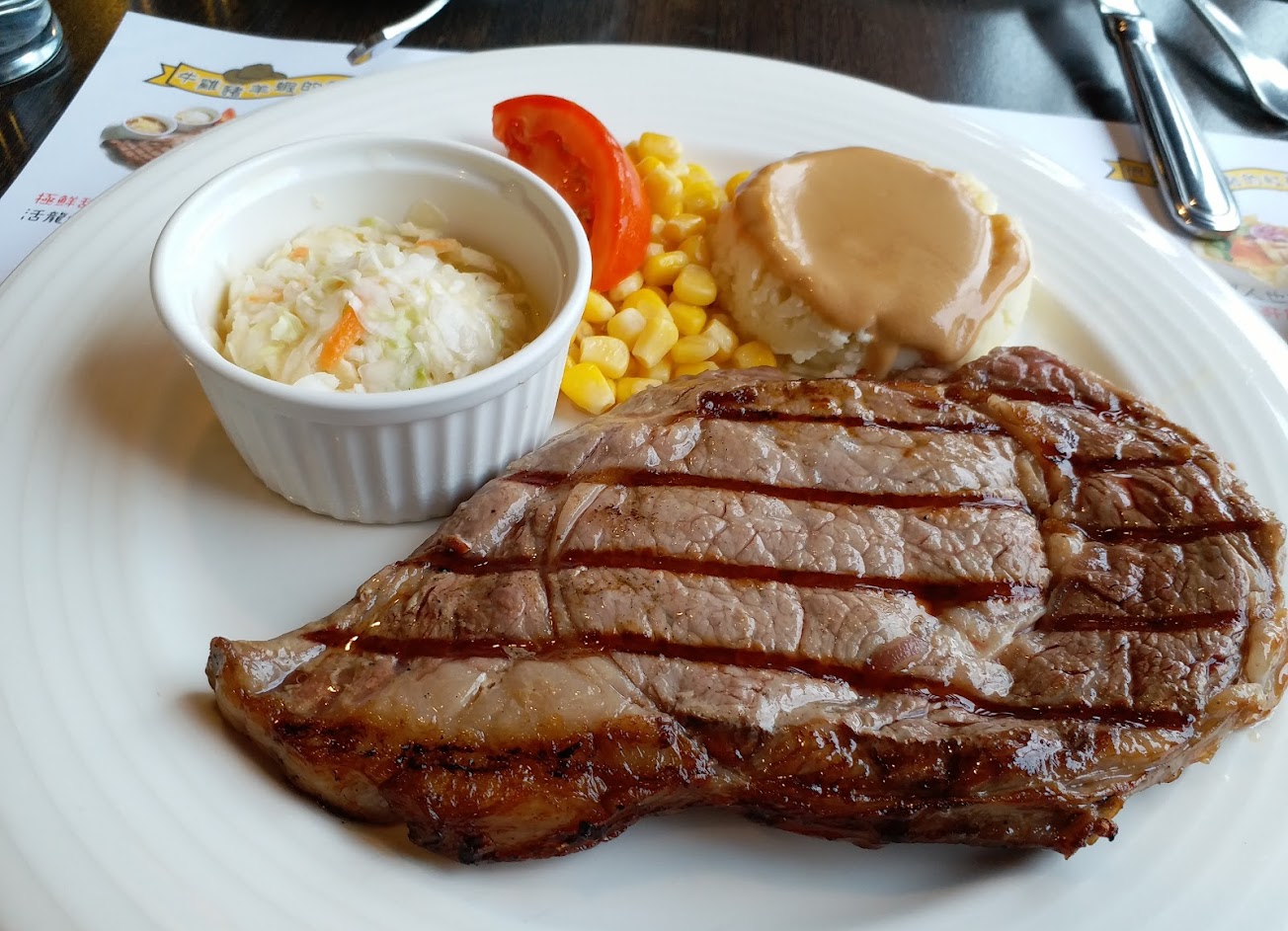 排餐的附餐很廉價感,沙拉有的生菜軟軟的,餐包很甜很難吃,杏鮑菇濃湯像在喝鮮奶油,主菜盤上的”泡菜”不予置評,玉米是加熱的罐頭玉米,馬鈴薯泥還可以,牛排點了沙朗、肋眼都不錯~
