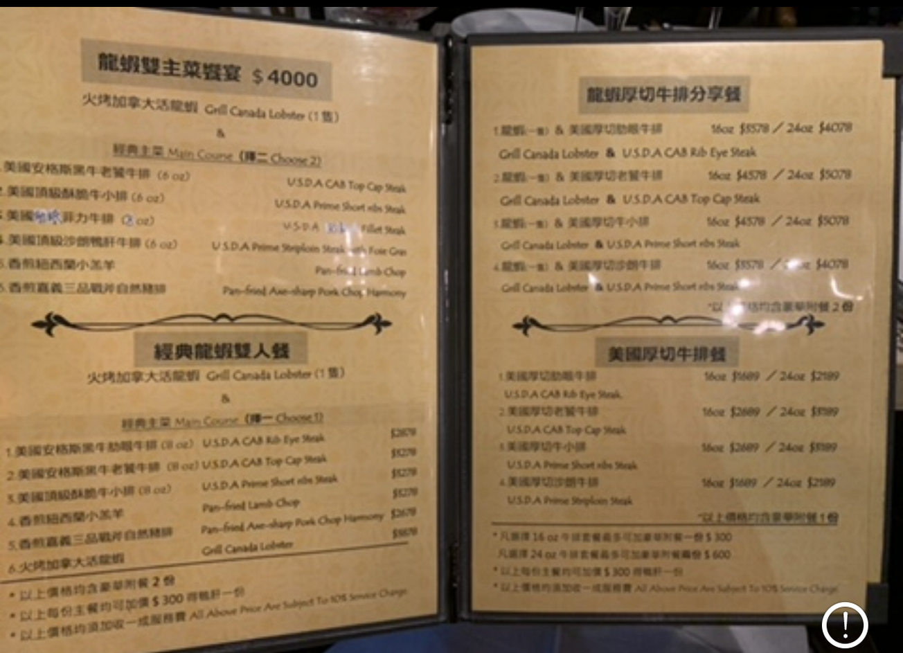 3.餐點評價 (1)麵包:剛加熱(烤)的歐式麵包,口感很好。 (2)湯:洋蔥湯有到位,香氣跟鹹度足夠。 (3)沙拉:蝦跟蔬菜都蠻新鮮的,燻鮭魚的培根好吃。 (4)開胃菜:服務生沒有說是什麼,但應該是伊比利火腿搭香瓜;口味上是沒有什麼問題,不過香瓜太冰破壞了口感。 (5)龍蝦:第一次吃純龍蝦料理,遠遠超過我預期的好吃;口感柔嫩而有嚼勁,蝦肉鮮甜多汁且帶一些海水的鹹味;而且龍蝦已經處理到很方便食用的狀態。 (6)牛排:牛排的口感真的沒話說,切開看它的色澤像是教科書上端出來的一樣,個人覺得比Ruth’s Cris優,大概在Danny & Company差不多。 (7)甜點:烤布蕾的布丁本身還行,可惜上面的焦糖太厚。