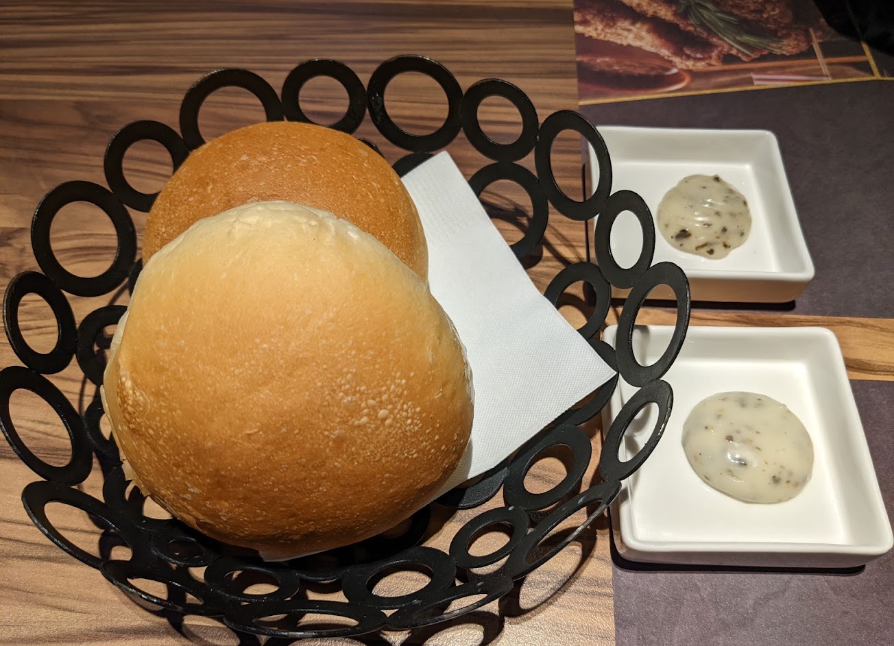餐點口味上,現烤餐包很大顆,搭配的松露奶油醬很香。