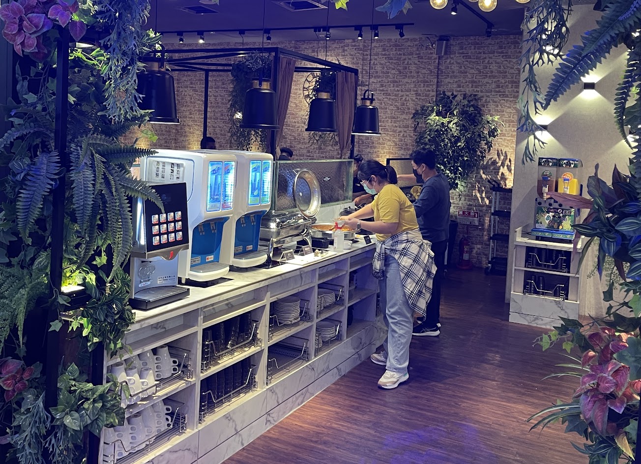 飲料機提供外面少見無糖紅茶與美祿冰沙,目前228連假店內人潮很多,服務人員很頻繁維持吧台與飲料機清潔。