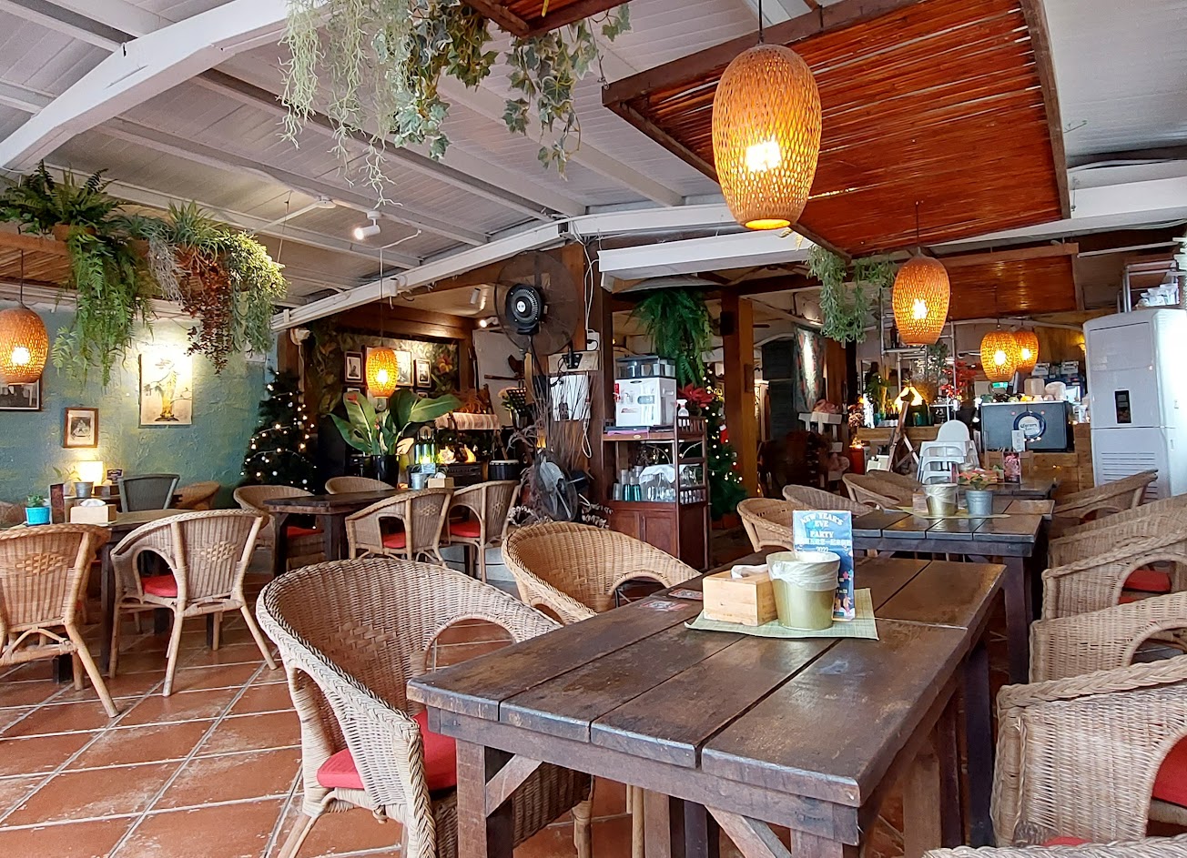 來的這天外面下雨所以沒有坐在室外座位吃飯。餐廳內裝潢別有一番風味,餐廳後門出去可以直接看到一整片的海景,還可以走下去海灘。