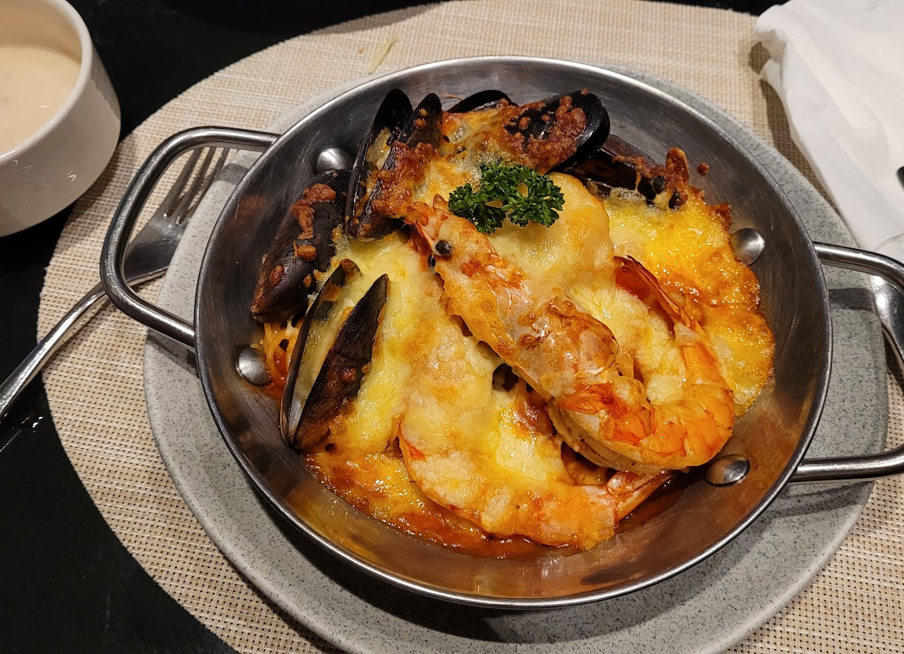 特別一提,這次牛排搭配了焗烤龍蝦,原本看到焗烤我倒退三步,覺得像一般焗烤料理可能加上美乃滋,一定很油膩,帶著本來就是來吃牛排的心態對龍蝦不抱任何希望,但老公突然說很好吃,我勉強吃了一口突然驚艷,刺破起司後溢出的白醬像濃郁的海鮮濃湯,不膩口外還非常鮮甜,帶著香氣十足的龍蝦香氣,再次勾出我的食慾。(因為套餐外還附有豪華自助吧,所以吃到主餐時我已經9分飽,但吃完龍蝦後覺得好像又餓了)