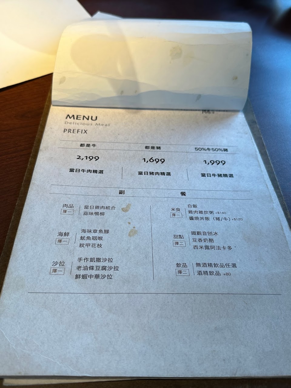 海味章魚腳, 鐵觀音刨冰, 組合牛肉盤, 極品燒肉, 石鍋拌飯, 霜降牛肉, 捏揉泰式酸辣義大利麵, 檸檬愛玉, 雞肉盛和, 牛肋條, 招待水煮牛肉, 秘製醬燒排肉, 大草蝦, 法式豬排, 油滋滋牛五花, 滷牛腱, 烤鴨夾餅, 透抽, 豆香奶酪, 日式刨冰