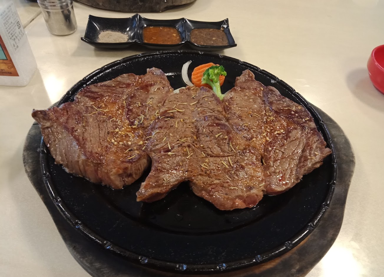 一開始吃味道還可以。份量大。但鐵板太熱…肉到後面都燒焦了,吃起來苦苦的。千萬不要點七分熟..不然會燒焦。位置偏遠但停車方便。