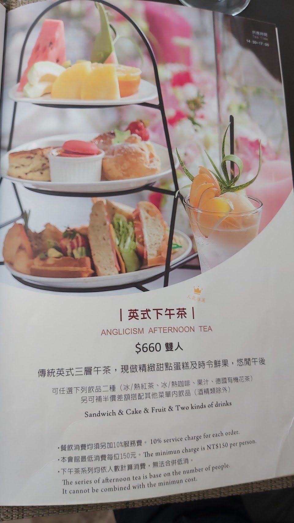 這邊真的很盤,低消1人要200,點圖片中的點心塔700多只能折抵2人低消,重點是點心塔並不好吃。重看不重吃。