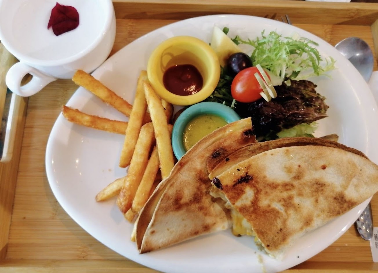 三個人點了 豐盛鐵板拼盤 香蕉鐵鍋熱蛋糕 墨西哥番茄雞肉烤餅 份量來說女孩兒恰恰好 Mini吐司沾奶油好吃? 歐姆蛋口感偏熟感搭配自製番茄醬汁風味清淡好吃 脆薯很棒 雞肉烤餅內有雙色生菜沾醬風味不錯佐嫩雞肉整體好吃! 蔬菜小鍋有佐清淡油醋,輕食無負擔! 熱蛋糕像偏乾的舒芙蕾,口感軟嫩不會濕濕的,邊邊有撒糖,稍微糖粉酥脆感,甜度適中,個人頗喜歡的! 咖啡香味濃郁;黑糖咖啡為表面撒上黑糖粉,喜歡黑糖香可以試試,別有一般風味!