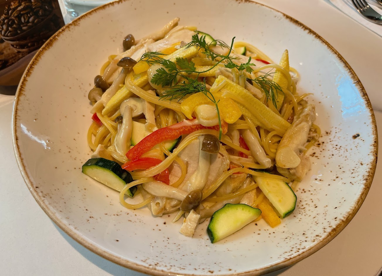 早午餐的「義式瘋狂水煮海鱸魚」很入味、「嫩煎馬告胡椒松阪豬」有點乾材,附餐咖啡很順口,面對公園視野棒是最大的加分點
