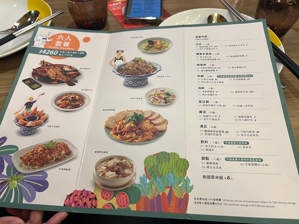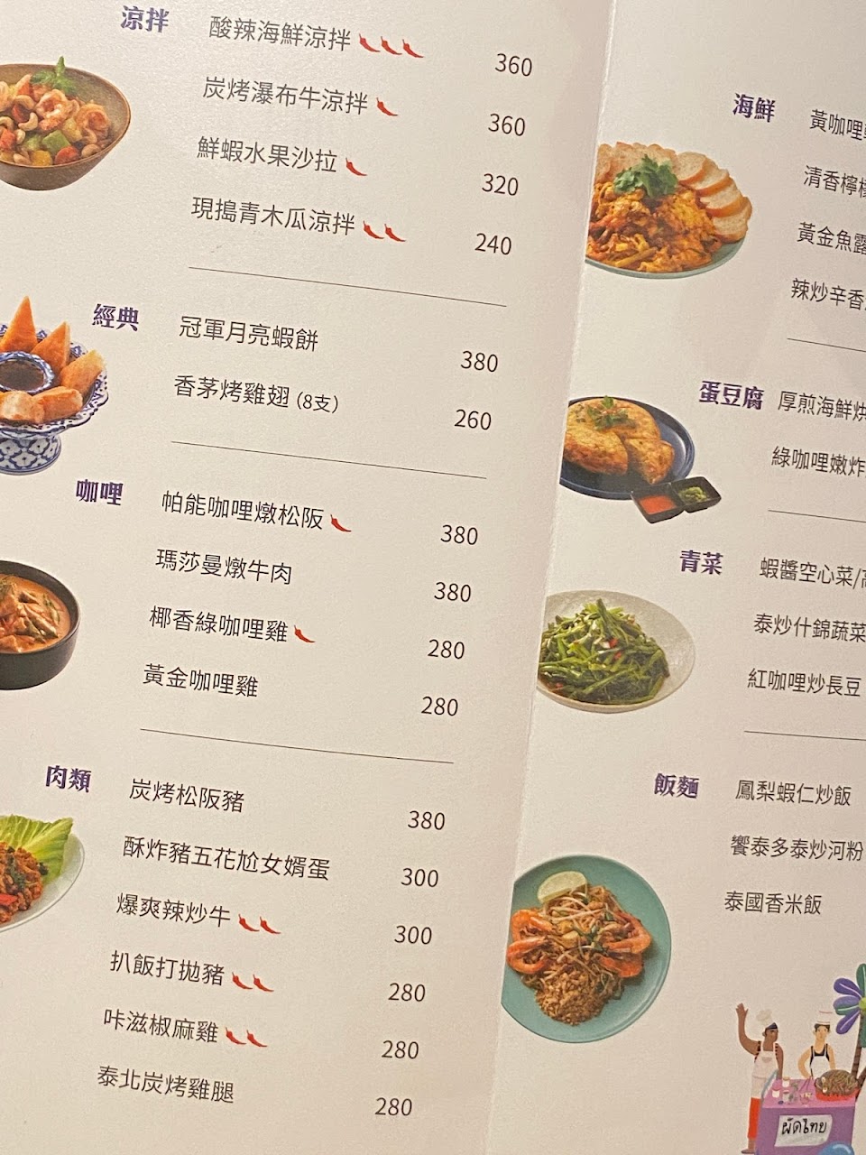 推薦品項:瀑布牛涼拌、月亮蝦餅、泰奶、帕能咖喱燉松板、檸檬魚、蝦醬空心菜等。