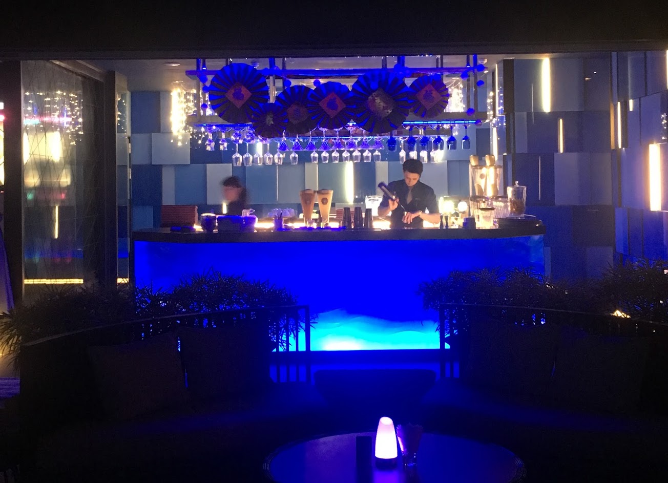 2.一入場整個周圍都是竪條,這點和Indigo開闊的夜景差很多,h2o讓人彷彿關在一個監獄裡,投影幕會一直播放mv這點是比indigo只投影mark好很多,但整體光線偏暗,吧台的藍光讓人感受到刺眼