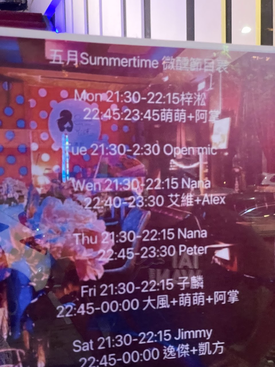 心得:週五晚上消費,約9:30開始會有駐唱歌手演唱。整體氛圍麻雀雖小但五臟俱全。看得出老闆娘的用心,小圓桌低消1500元/桌、大桌2000元/桌。