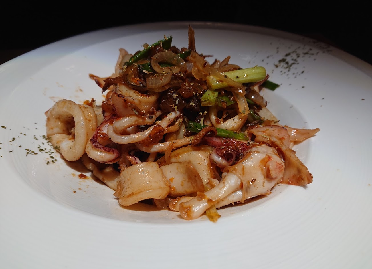 木質的吧檯、暈黃的燈光、各種酒類的櫃子,十足的餐酒館氛圍,重點是餐點實在好吃,除了點客率很高的厚切豬排飯、明太子烏龍麵、塔香炒時疏、墨西哥手羽,我們還品嘗了韓式泡菜澎湖中卷、西班牙伊比利梅花豬,這兩道也是令人驚豔!中卷加泡菜的組合意外地的好吃,完全沒有豬燥味的伊比利豬覆上滿滿的洋蔥絲,新鮮的洋蔥絲反而中和了單吃肉類的的膩感。