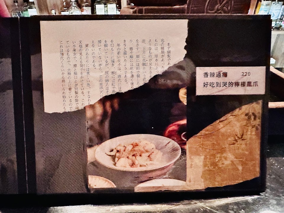 菜單是用相簿製作的很特別,喜歡魂牽夢縈的茶具設計~香辣過癮好吃到爆的檸檬雞爪必點!真的好辣好好吃~整體裝潢很有特色,ig用名片拍立得打卡限時會給shot!可惜吧台座椅比較不好坐⋯⋯? …