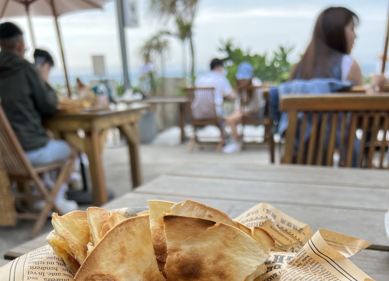 如果有10顆星我絕給,餐點我們是點烤餅跟薄餅還有炸物拼盤,味道鹹香酥脆非常值得試試,完全非常好吃不失敗的餐點,價錢我覺得非常合理4個人點4份餐3個飲料也才一人500塊而且吃超飽,風景很漂亮,服務人員態度也很好,超級推薦來這邊。