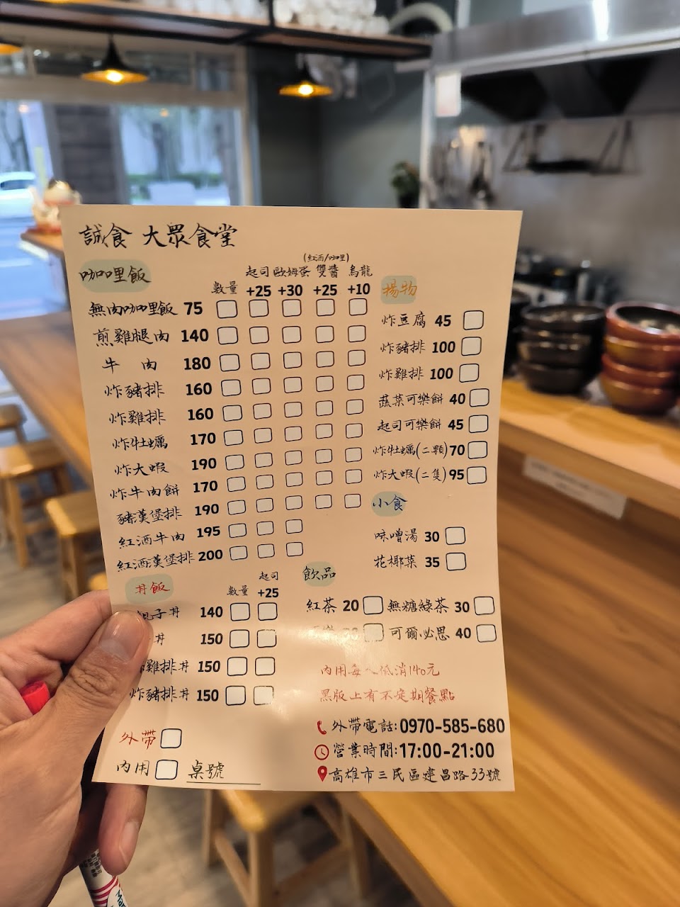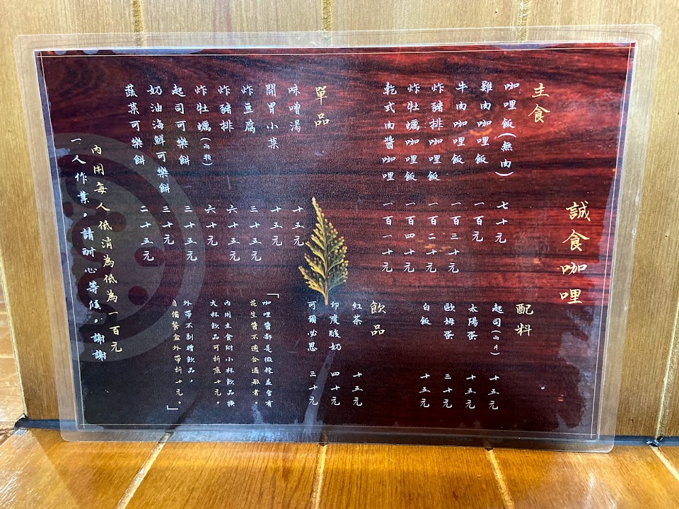 販售餐點內容主要為咖喱飯、丼飯等主食搭配炸物,店內有小黑板記有不定期的餐點。