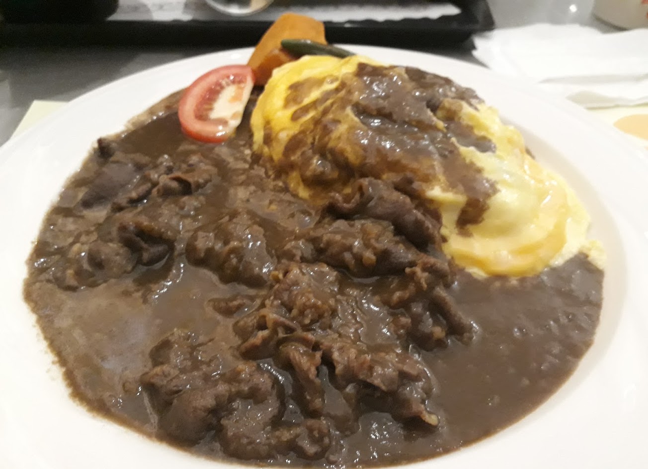 隨餐南瓜湯味美料實在,咖哩肉多、口味特別,蛋包飯蛋皮厚實。推,河堤美食。