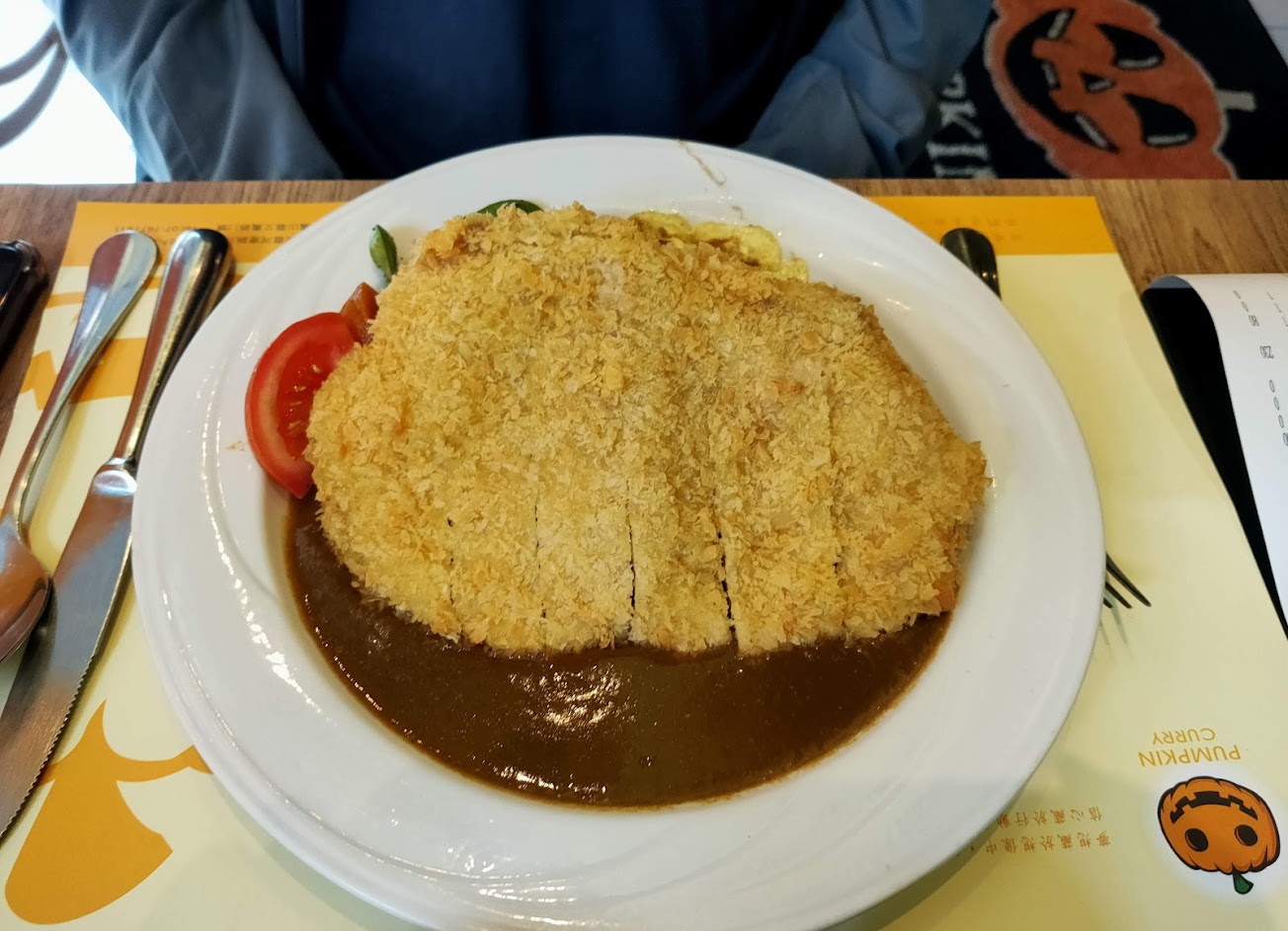今天第一次,去南瓜咖哩吃飯,點了藍帶豬排蛋包飯,真的覺得很好吃,他的咖哩醬很特別很好吃。