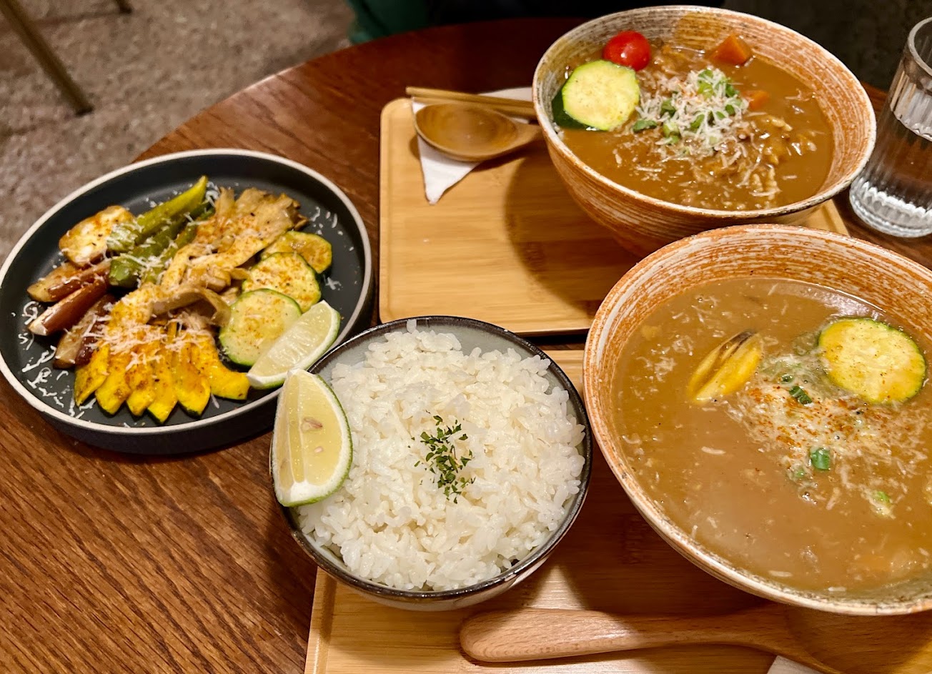 點了招牌的激 炸雞塊咖喱飯、滑蛋小雞丼與香料溫烤時蔬。炸雞塊的面皮很薄,吃得到炸過麵包粉的味道,灑上起司絲非常美味,咖喱的辛辣在入口的後段才會跑出來,偏小小辣的重口味口感,很下飯,只是量偏少。滑蛋小雞丼的調味整體偏甜,雞肉鮮嫩有種家常菜的感覺。溫烤時蔬其實就和咖喱飯的配菜一樣,將櫛瓜、杏鮑菇、茄子、南瓜切成薄片佐香料下去烤,味道不錯。