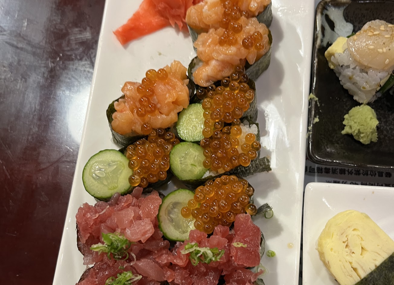 之前有外帶過B餐吃起來還行,但今天去內用心情受影響,先是上菜的時候哇沙比整陀黏在盤身上,跟菜鳥服務員說了之後,他們指著笑一笑就當沒事,還是跟比較資深的說了之後才補一小盤哇沙比;然後是這個壽司一入口都差點被刺到,連三顆都是這樣 直接吐在桌上不吃,花壽司疑似有狗毛但我有摸狗 雖然有洗手但已經不可考所以就算了,品項是A餐希望下次吃不會這樣。
