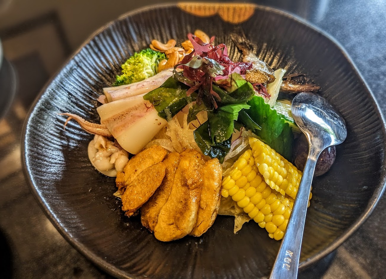 這次老闆娘極力推薦的炸大明蝦。儘管價格不菲,每隻蝦要價NT$300,但大明蝦的海鮮風味充分展現,讓人彷彿置身於海洋之中,口感獨特。這家台日式料理餐廳以其獨特的餐點、舒適的用餐環境,帶來了優質的用餐體驗。如果你尋找一個舒適而有特色餐點的用餐地點,這裡絕對是一個不容錯過的選擇。