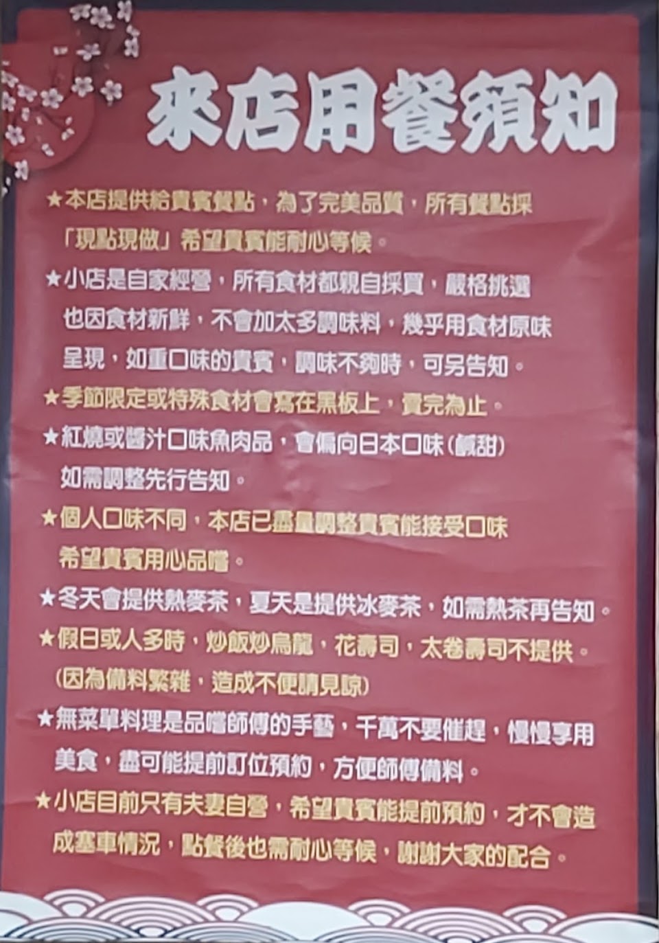 原本要我們谷歌評價,但嚐鮮後,口味確實不錯,生魚片新鮮,握壽司跟醋飯也很棒,手捲的蘋果還細心的切成條狀,更細心的醃小黃瓜還特別切成小片狀,讓口感更好。