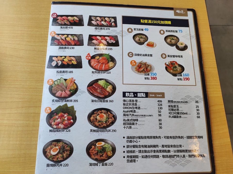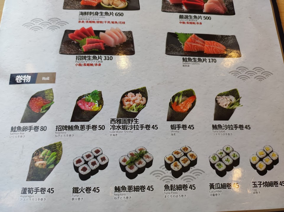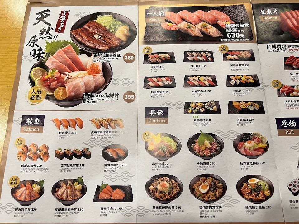鹽烤天使紅蝦, 章魚燒, 味噌湯茶碗蒸, 鮪盛合彩衣, 綜合壽司套餐, 醬燒鮪魚骰子, 鮭魚親子丼, 鮭魚生魚片, 醬燒豚肉丼