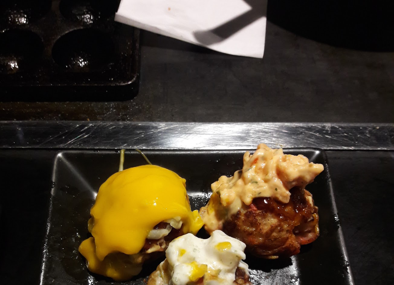 店員都相當熱情服務也好,與我們說說笑笑,而且最好玩的是⋯可以自己製作大阪燒、文字燒,章魚燒等等,當然要請店員幫忙全部完成也是可以⋯我們就自行體驗了一下烹煮的過程,相當有趣? 但章魚燒因為感覺需要一點技術,所以我們直接放棄自己用。章魚燒有龍蝦沙拉,蔥鹽,沙拉口味,每種口味都蠻好吃的。文字燒部分的鍋巴也很好吃,酥脆且香氣十足。反倒是大阪燒表現較為普通,就是一般能想像到的口味。