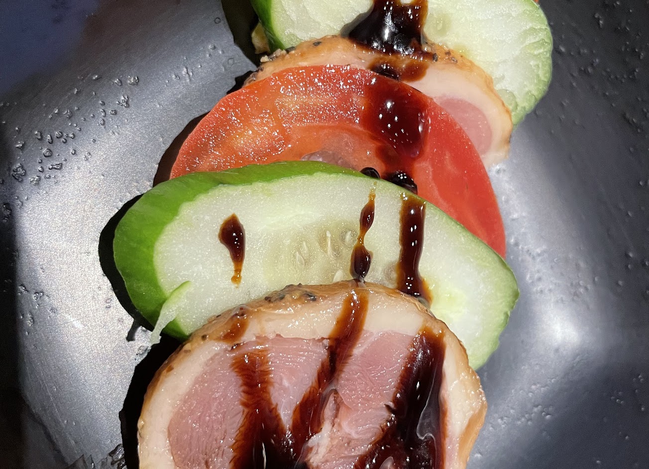 綜合生魚片, 茶碗蒸, 涼拌櫻桃鴨捲, 香菇絲瓜