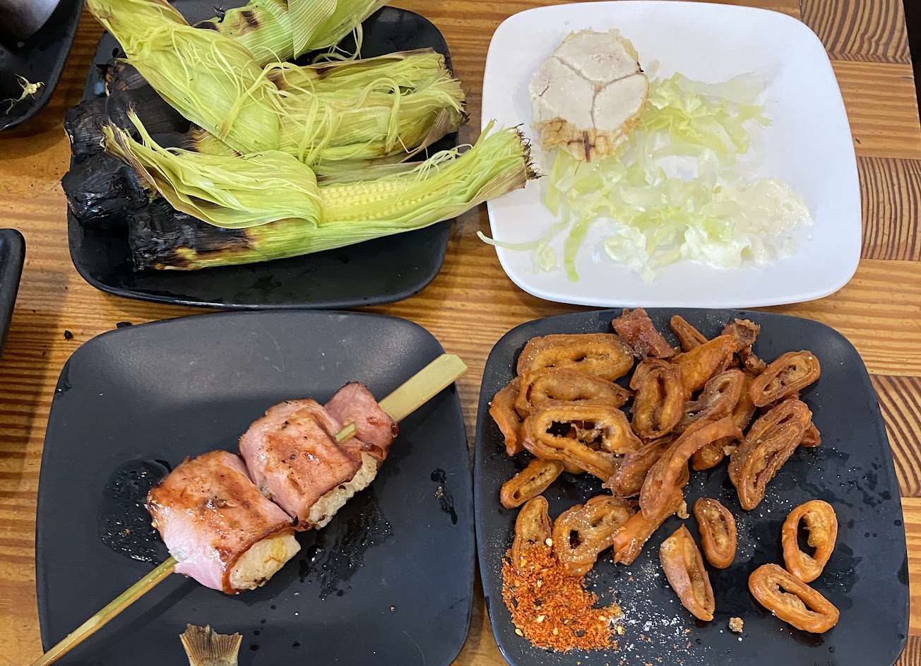 炙燒五花牛, 龍蝦沙拉手捲, 酥炸大腸, 塔香蛤蜊, bbq雞肉串