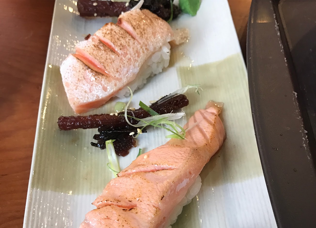 虎掌飯好吃,生意很好,開到兩間,要排隊,炙燒鮭魚($60),很厚,好吃!有免費飲料可以喝。