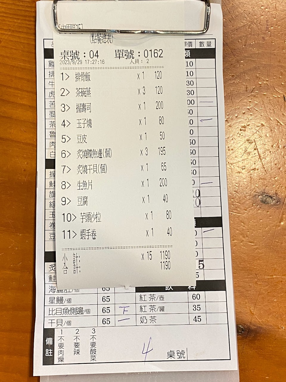 蝦手卷40蘆筍40鮭魚卵手卷65, 生魚片, 虱目魚飯, 炸排骨, 芋泥沙拉, 肉燥飯