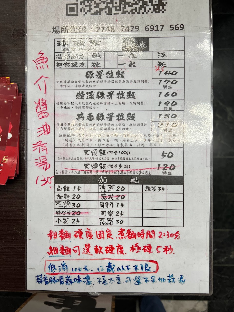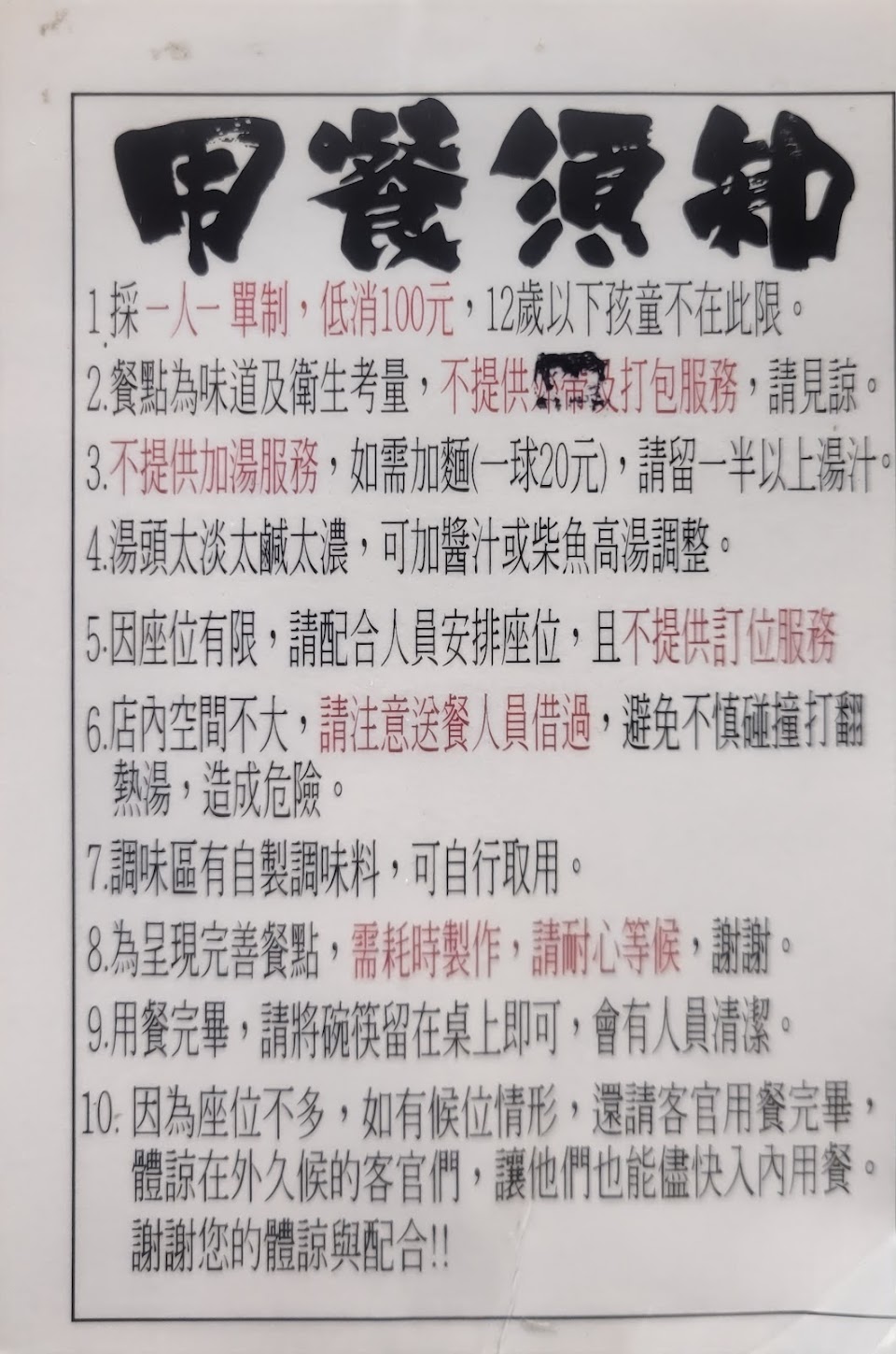 首先提供檸檬水,以及2l裝水的容器不用再來回裝水,其二有七種不同的免費的配料,面可以選粗細,湯有淺鹹,服務人員態度很好,場外排隊也有再管理,重要的是餐點很棒,建議大家吃一次看看
