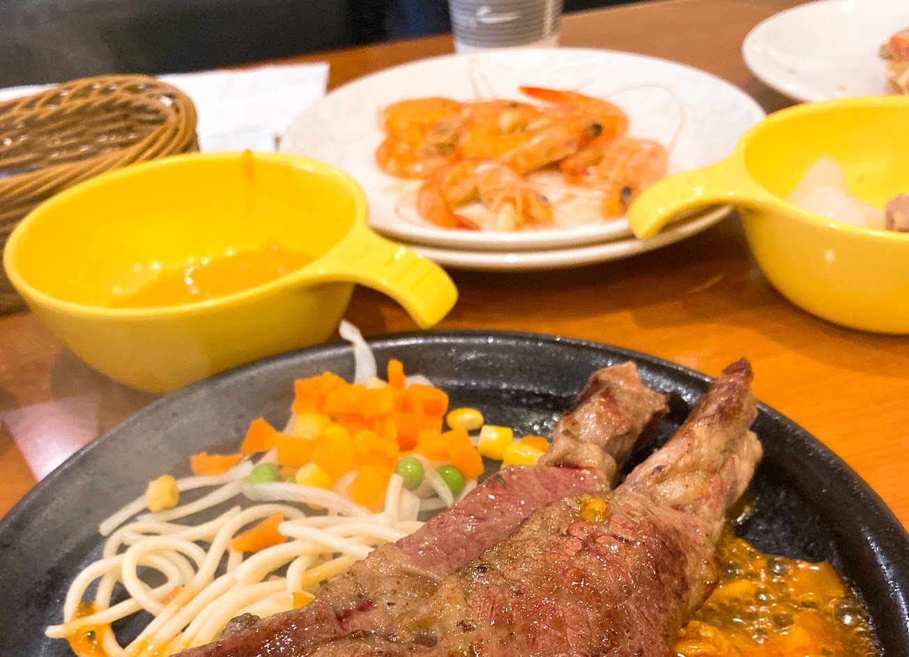 牛排香嫩、小菜隨時補滿且種類多,有甜點、冰淇淋,五臟具全很不錯