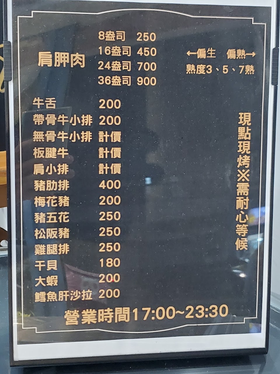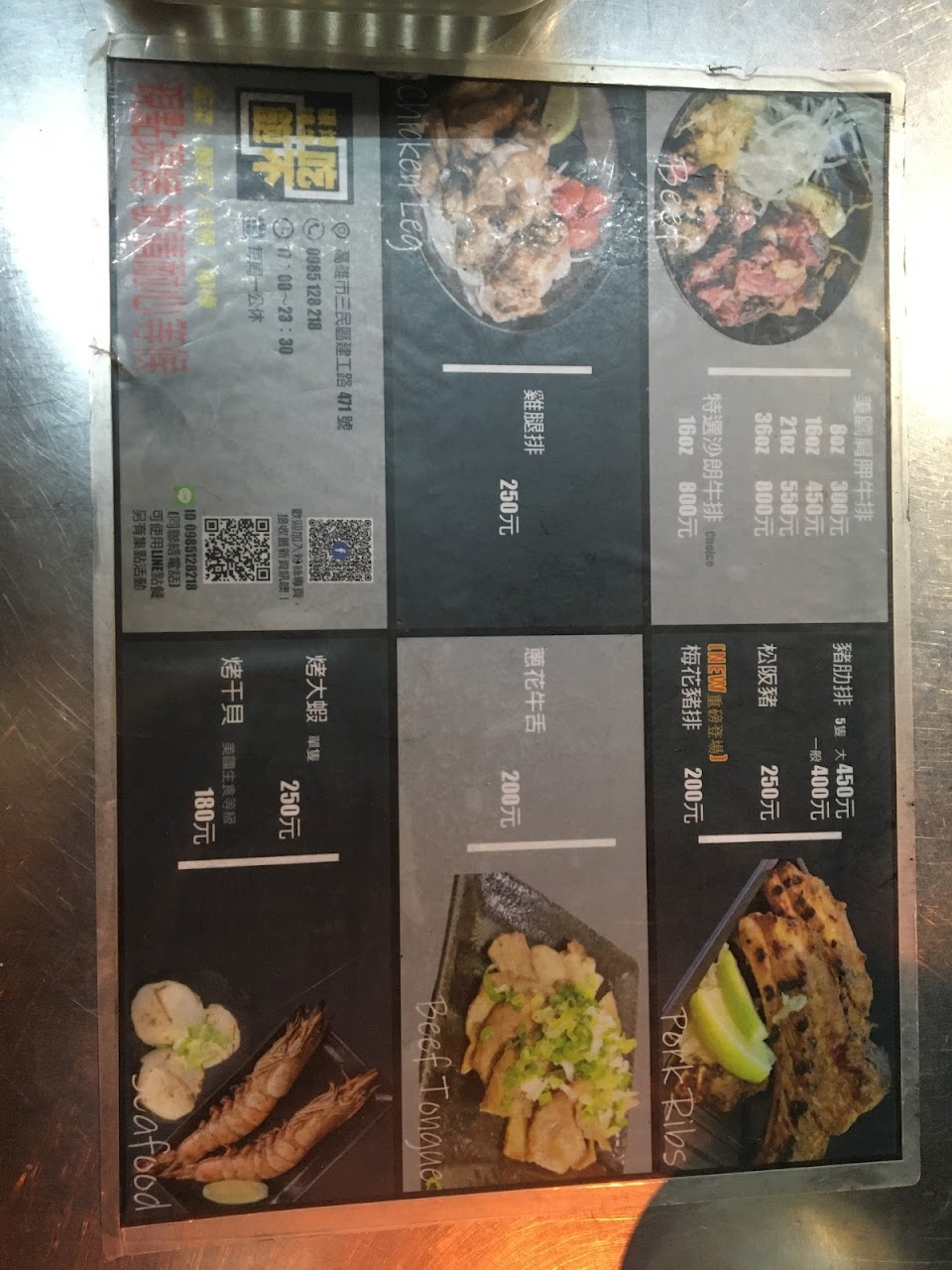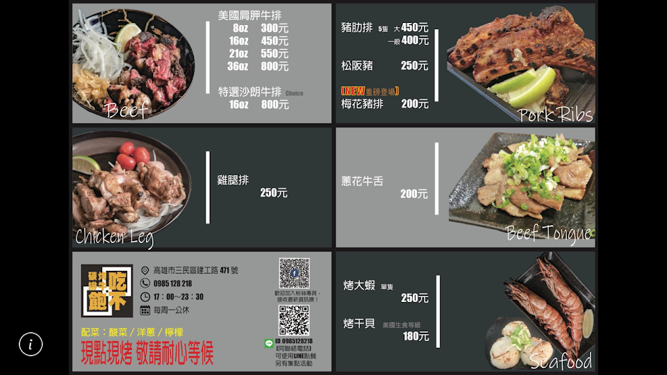 這裡有美味的碳烤牛排、牛舌(我的最愛)、松板豬、大蝦、雞腿排、生食等級干貝……等。