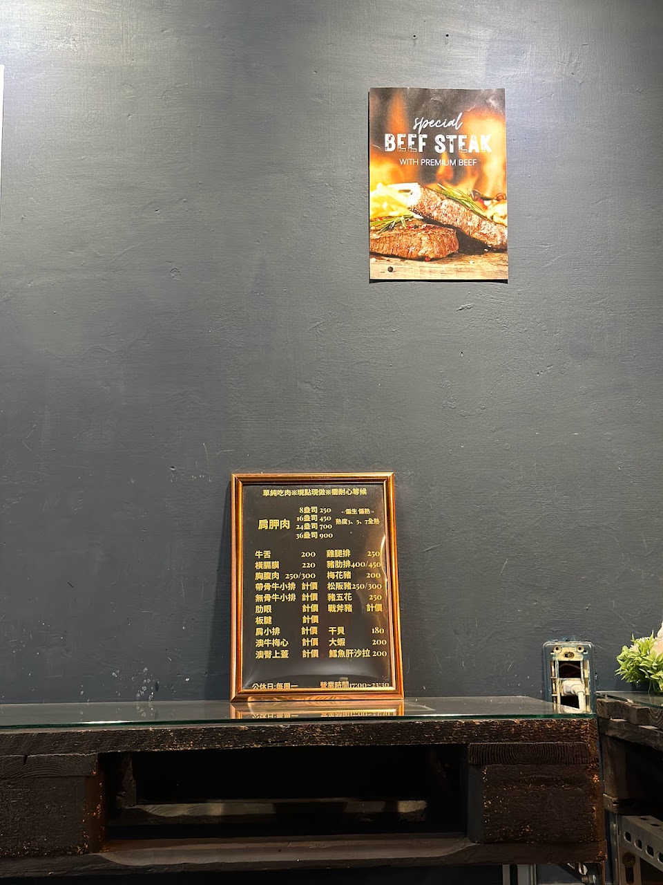 肉品都是真材實料,現點現烤所以要稍微等待一下,可以帶外食來吃(這我很訝異),老闆非常客氣,店內空間不大,但吃完身上不會有牛排味(老闆在門口烤),值得大家來試試!!